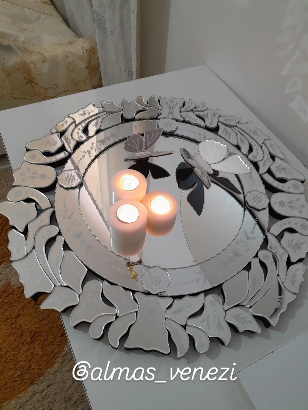 آینه ونیزی رانر گرد پرکار ابعاد قطر ۶۰ تولید کننده خاص ترین آینه های ونیزی با طرح و ابعاد و رنگ دلخواه شما توسط تیم متخصص الماس ونیزی مستقیم از کارگاه ارسال میشه باتضمین کیفیت و پایین ترین ثبت.